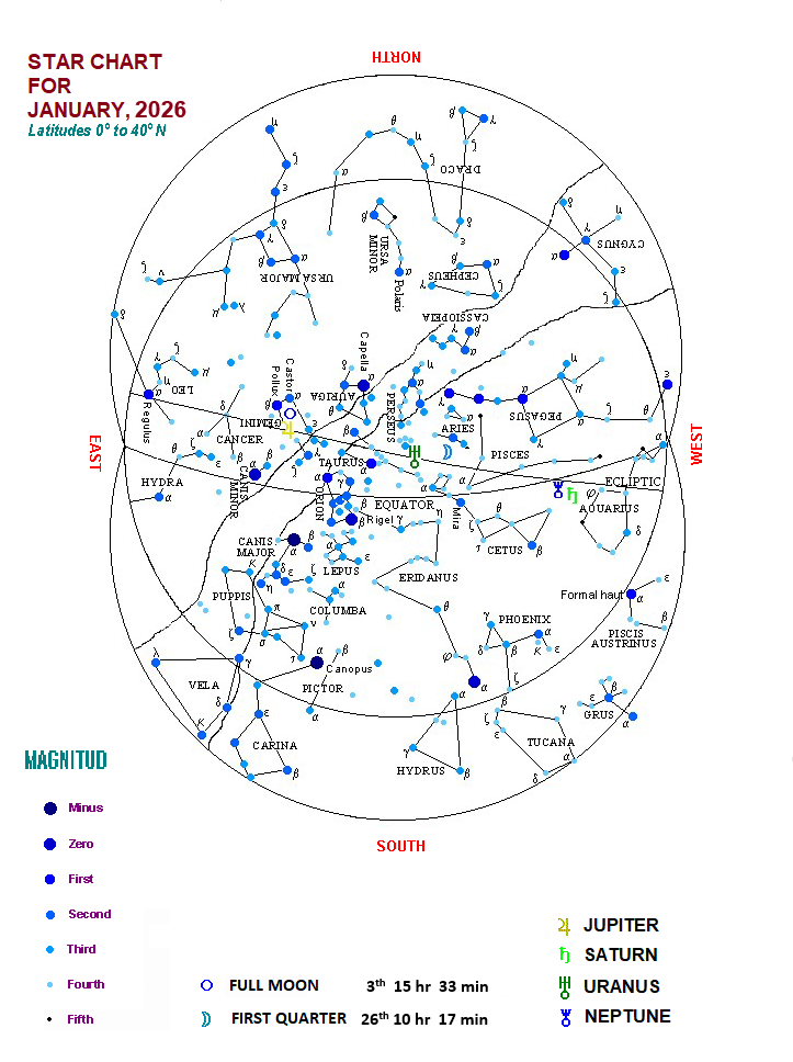 The Moon passes about 3½º north of Jupiter on 4th before sunrise, about 2½º south of Mars on 18th, about 1½º south of Mercury on 18th, about 2º south of Venus on 19th, about 4½º north of Saturn on 23rd after sunset, about 3½º north of Neptune on 23rd before midnight, about 5½º north of Uranus on 28th just after midnight of 27th, about 4º north of Jupiter on 31st. The Earth The Earth approaches the perihelion position on its orbit or reaches nearest to the Sun on 4th. The PlanetsVisibility of Planets: Mercury: The planet rises about 1 hour before sunrise on 1th of the month. From 2nd planet is too close to the Sun to be visible. The planet is at aphelion or farthest from the Sun in its orbit on 6th. The planet is in Superior conjunction with the Sun on 21st. Venus: The planet is too close to the sun to be visible. The planet is in Superior conjunction with the Sun on 6th. The planet is at aphelion or farthest from the Sun in its orbit on 23rd. Mars: The planet is too close to the sun to be visible. The planet is in conjunction with Sun on 9th of the month. Jupiter: The planet rises about ½ hour after sunset to close to sunset time upto first quarter of the month and thereafter planet sets about ½ hour to 1 hour before sunrise upto third quarter of the month and about 1 hour to 1½ hours before it for the remaining days of the month. The planet is in Opposition with the sun on 10th. Saturn: The planet sets about 1½ hours to 2 hours before local midnight time upto second quarter of the month, about 2 hours to 2½ hours before it upto third quarter of the month and about 2½ hours to 3 hours before it for the remaining days of the month. Uranus: The planet sets about 3 hours to 2 hours after local midnight time upto third quarter of month and about 2 hours to 1 hour after it for the remaining days of the month. Neptune: The planet sets about 1 hour to 1½ hours before local midnight time upto first quarter of the month, about 1½ hours to 2 hours before it upto second quarter of the month, about 2 hours to 2½ hours before local midnight time upto third quarter of the month and about 2½ hours to 3 hour before it for the remaining days of the month. Conjunction of Planet: Venus passes about ½º north of Mars on 8th. Mercury passes about ½º south of Mars on 18th. Mercury passes about ½º north of Venus on 29th.