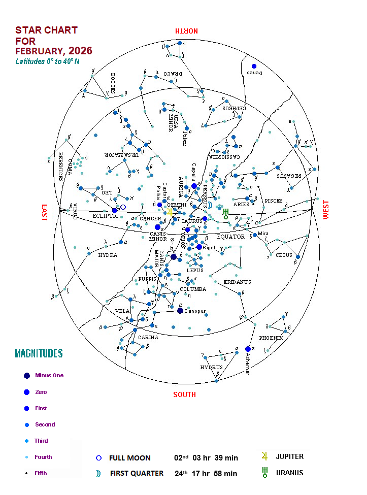 The Moon passes about 1º south of Mars on 16th, about 1½º north of Venus on 18th, about ½º south of Mercury on 19th, about 3½º north of Neptune on 20th, about 4½º north of Saturn on 20th, about 5½º north of Uranus on 24th, about 3º north of Jupiter on 27th. Eclipse Solar Eclipse: Annular solar eclipse will occur on 17th February. The eclipse begins at 15-27 I.S.T. and ends at 19-58 I.S.T. The eclipse will not be visible in India. The PlanetsVisibility of Planets: Mercury: The planet is too close to the Sun to be visible upto 4th. From 5th it becomes visible in the western sky after sunset. It sets about ½ to 1 hour after sunset initially, increasing gradually. It is in Greatest Eastern Elongation (~18º) on 19th. It reaches Perihelion on 19th. Motion becomes Retrograde from 26th. Venus: Not visible upto 1st. From 2nd, visible in western sky after sunset. Sets ½ to 1 hour after sunset throughout the month. Mars: Too close to the Sun to be visible. Jupiter: Sets 1½–2 hours before sunrise early, increasing to 2½–3 hours before sunrise. Saturn: Sets 3½–3 hours after sunset early, reducing gradually to 1½–2 hours after sunset. Uranus: Sets around midnight initially, then earlier. Motion becomes Direct from 4th. In Quadrature on 16th. Neptune: Sets 3½–3 hours after sunset early, reducing gradually. Conjunction of Planet: Mercury passes about 4½º north of Venus on 27th.